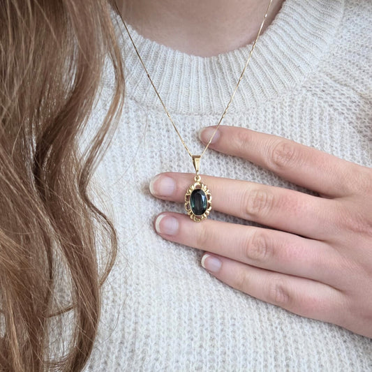 Vintage 14k gouden broche met maansteen cabochon en groene toermalijn