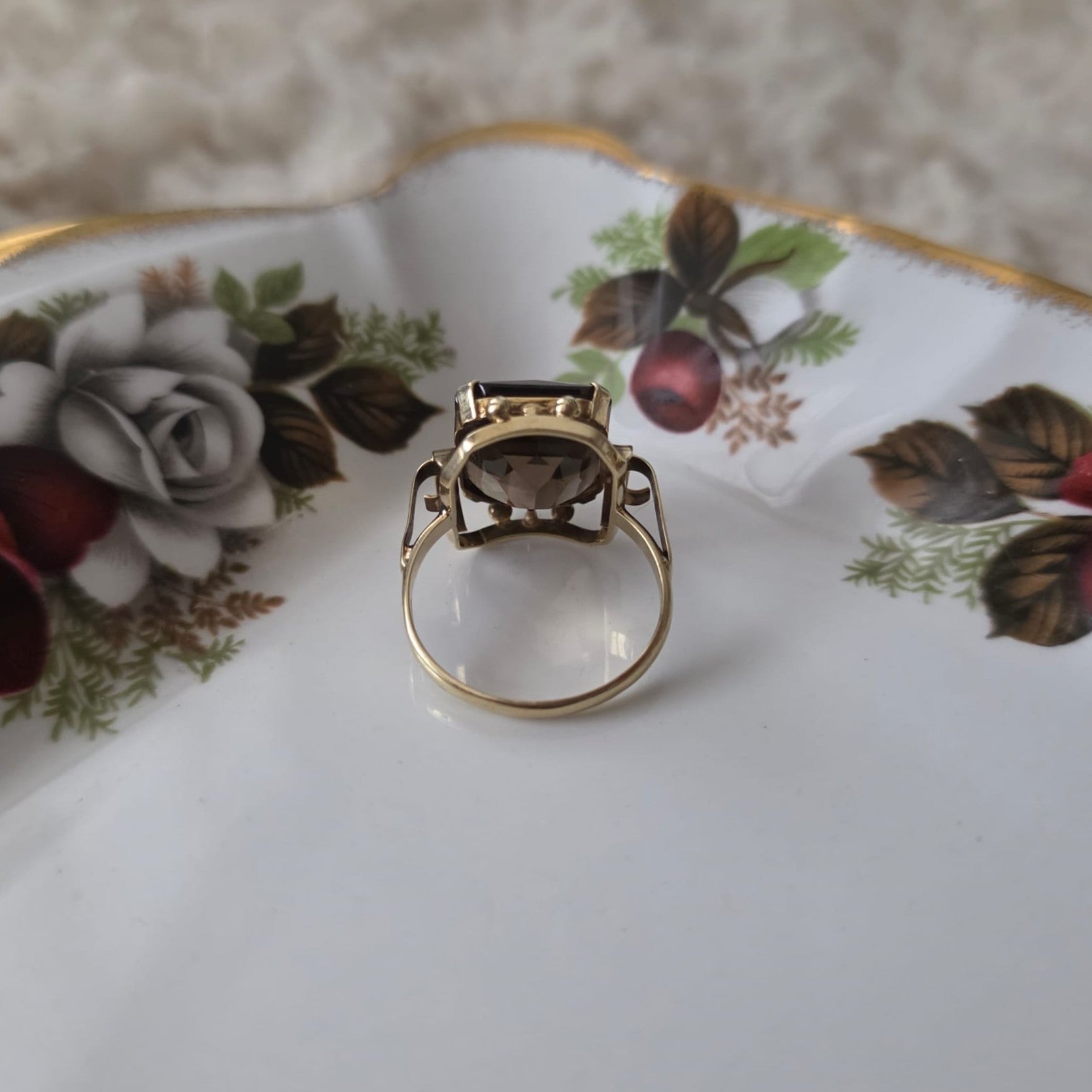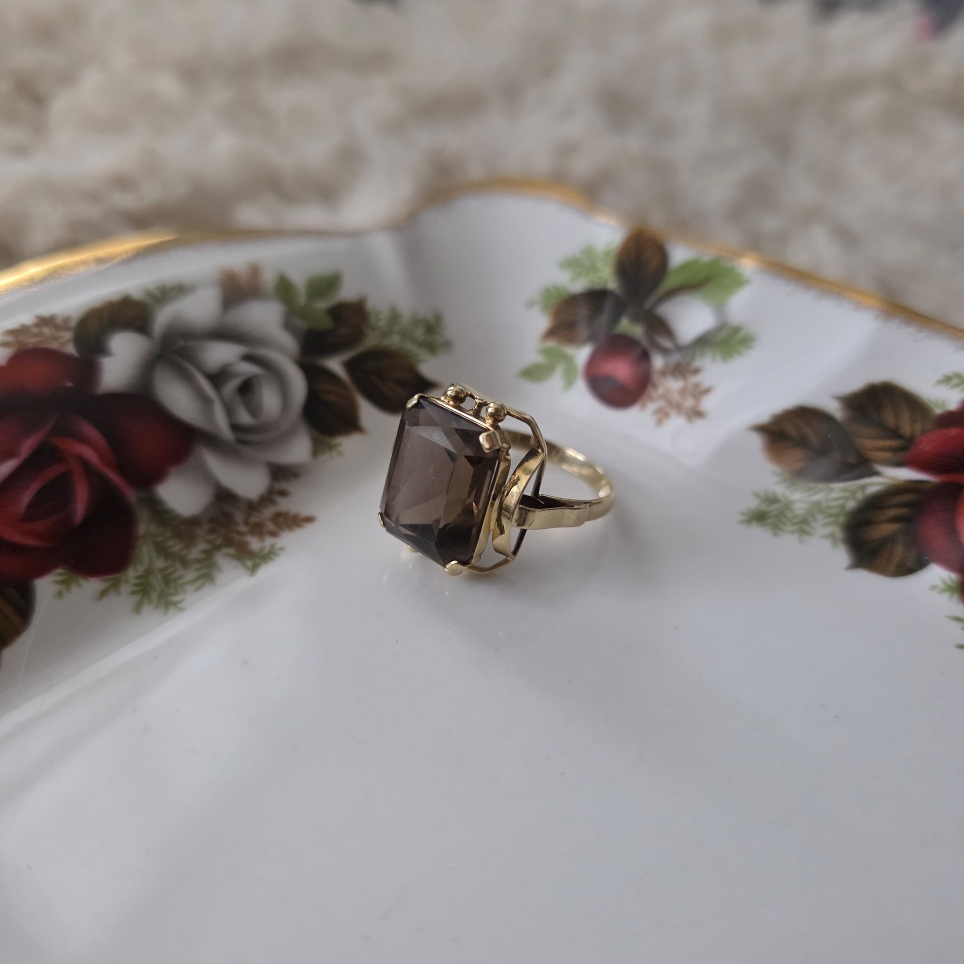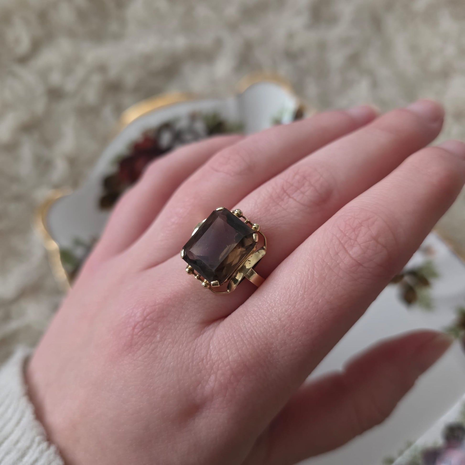 Deze vintage ring is gemaakt van 14k geel goud (goud code 585), voorzien van een prachtige rookkwarts edelsteen en is verkrijgbaar in maat 18. De steen zit in een prachtige versierde geometrische zetting. Deze ring weegt maar liefst 5 gram en is daarmee zeker een investment piece. Voeg een vleugje tijdloze elegantie toe aan uw sieradencollectie met dit vintage exemplaar.