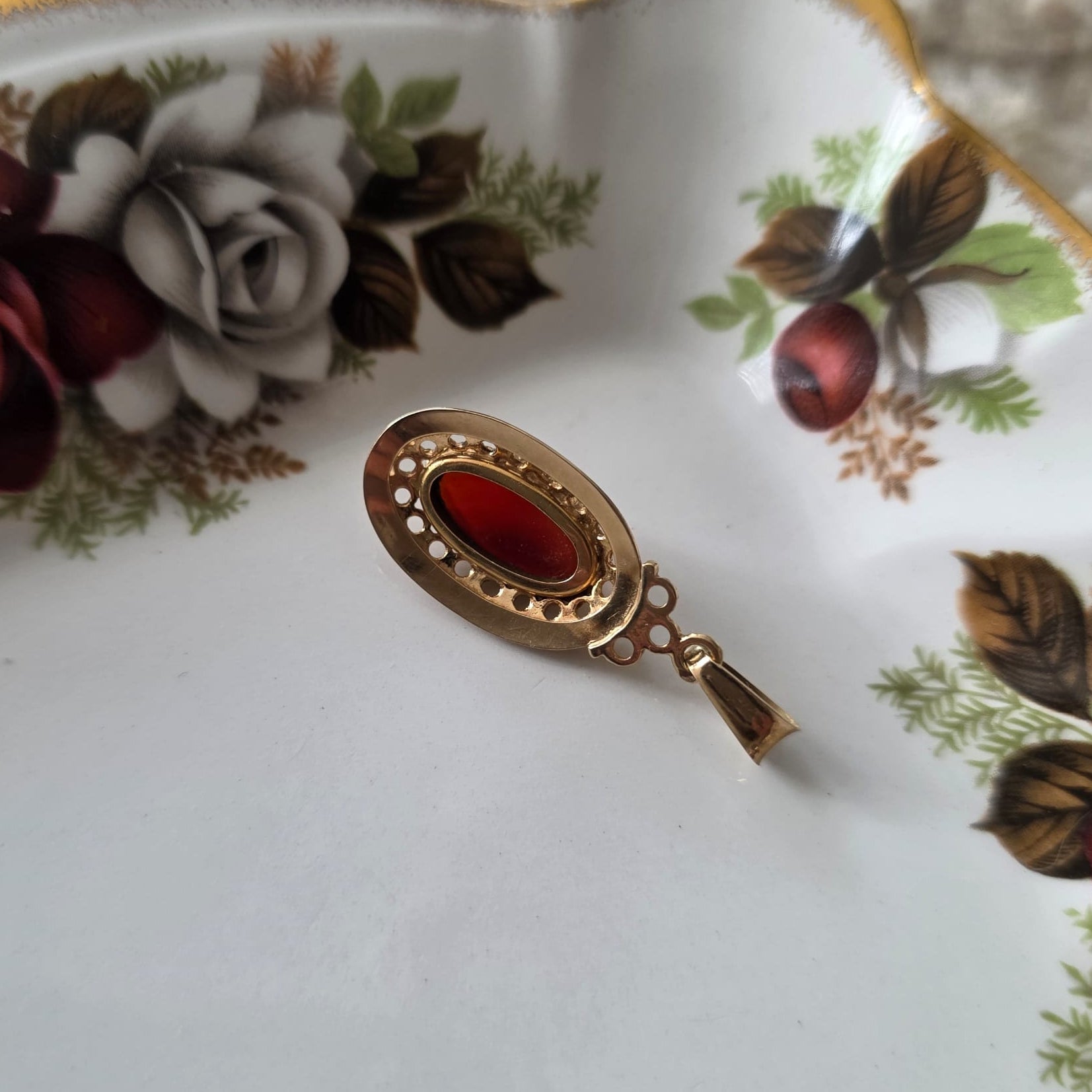 This vintage pendant is crafted from 14k yellow gold (gold code 585) and features a beautiful carnelian gemstone. The stone is set in a beautiful traditional setting. Add a touch of timeless elegance to your jewelry collection with this vintage piece.