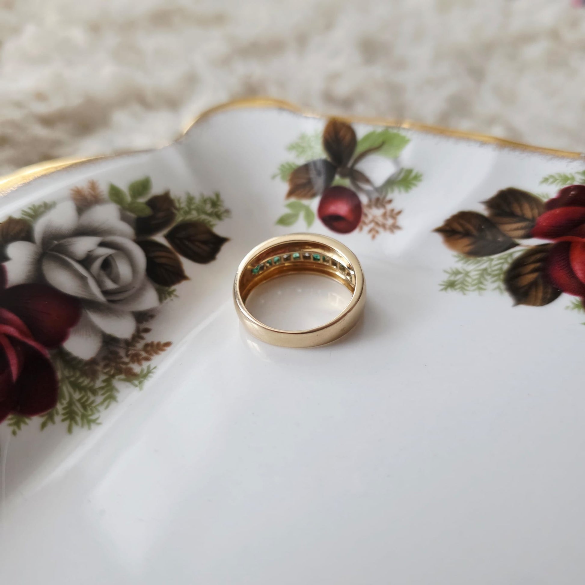 Deze vintage ring is gemaakt van 14k geel goud (goud code 585), voorzien van een rij smaragden en diamanten en is verkrijgbaar in maat 18.5 - 58. Met een solide gewicht van 4.8 gram is dit een echte investment piece! Voeg een vleugje tijdloze elegantie toe aan uw sieradencollectie met dit vintage exemplaar.