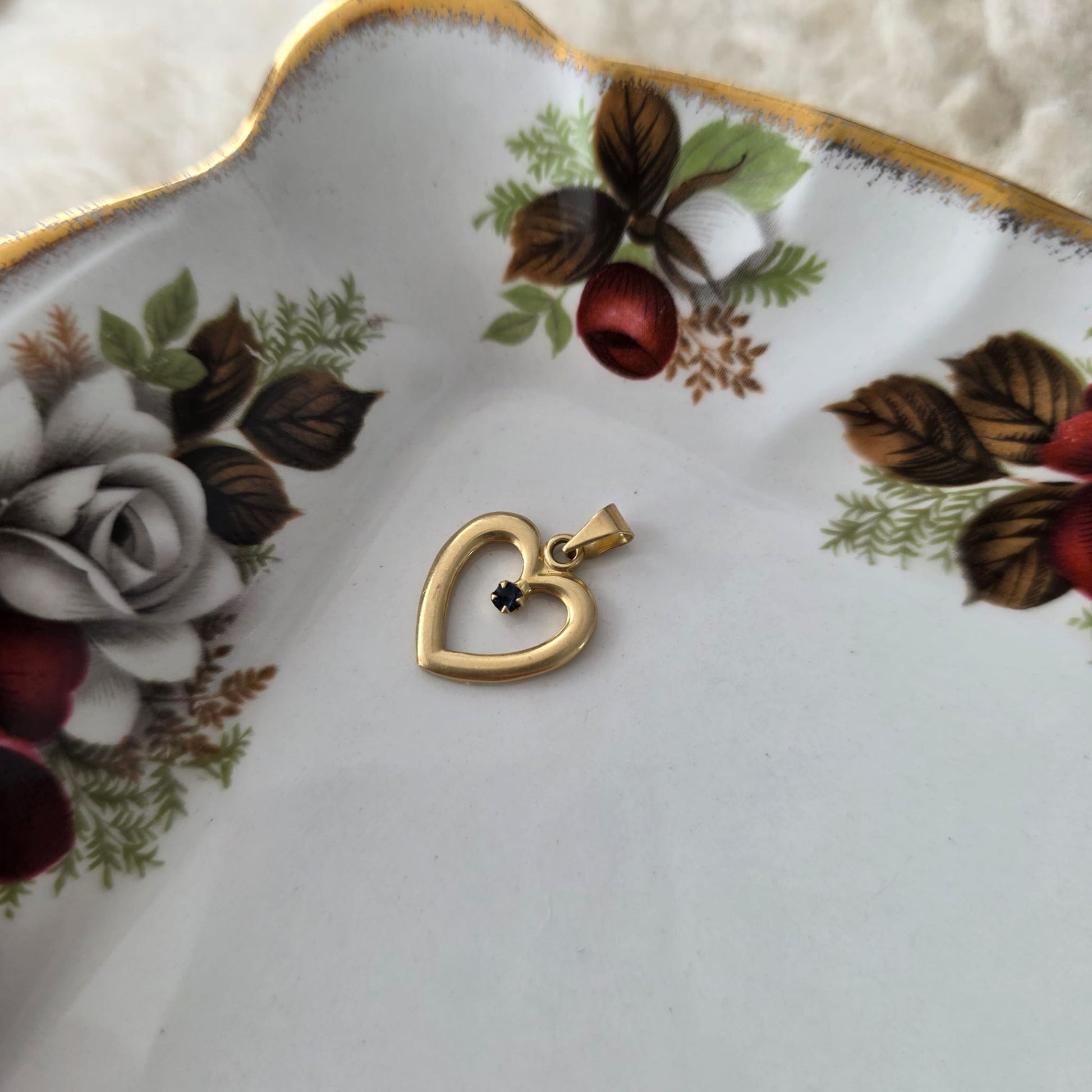 Deze vintage hanger is gemaakt van 18k geel goud en heeft de vorm een hart met een saffier steentje. Voeg een vleugje tijdloze elegantie toe aan uw sieradencollectie met dit vintage exemplaar.