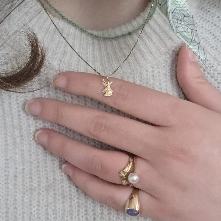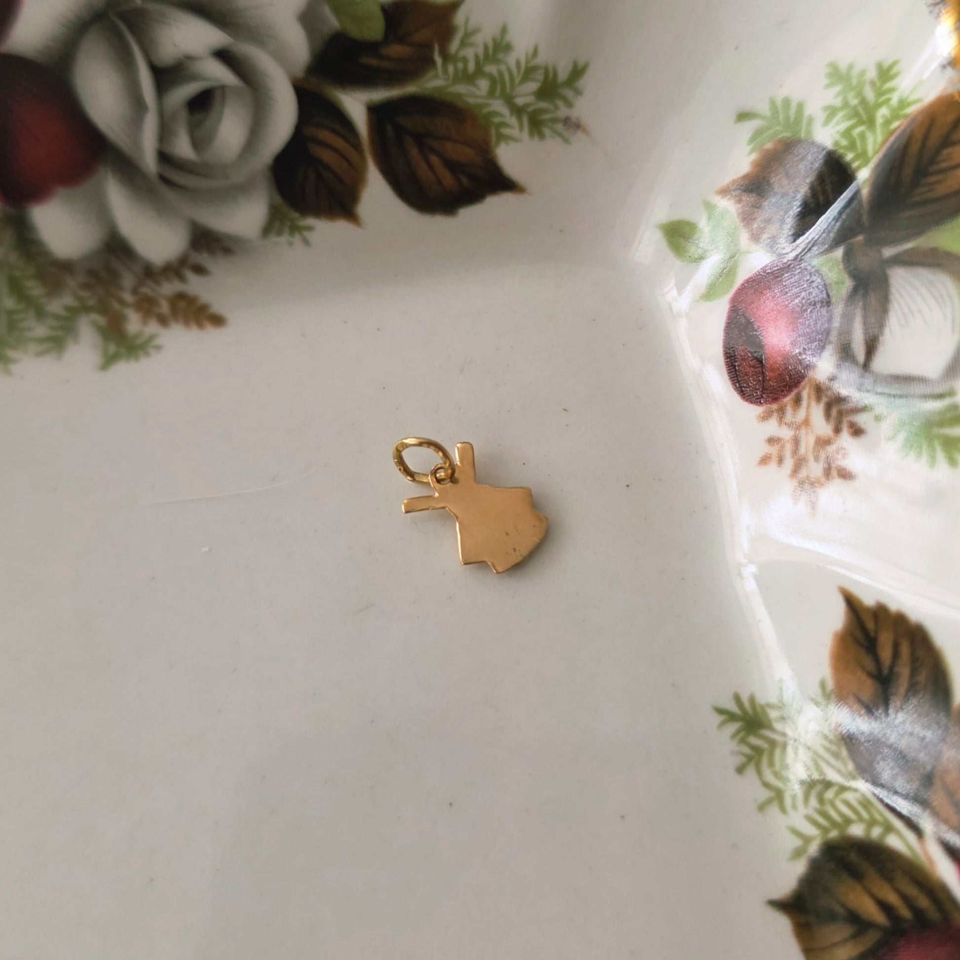 Deze vintage hanger is gemaakt van 18k geel goud en heeft de vorm van een molentje. Dit is een klein hangertje en daarmee ook geschikt voor een oorbel of bedelarmband. Voeg een vleugje tijdloze elegantie toe aan uw sieradencollectie met dit vintage exemplaar.