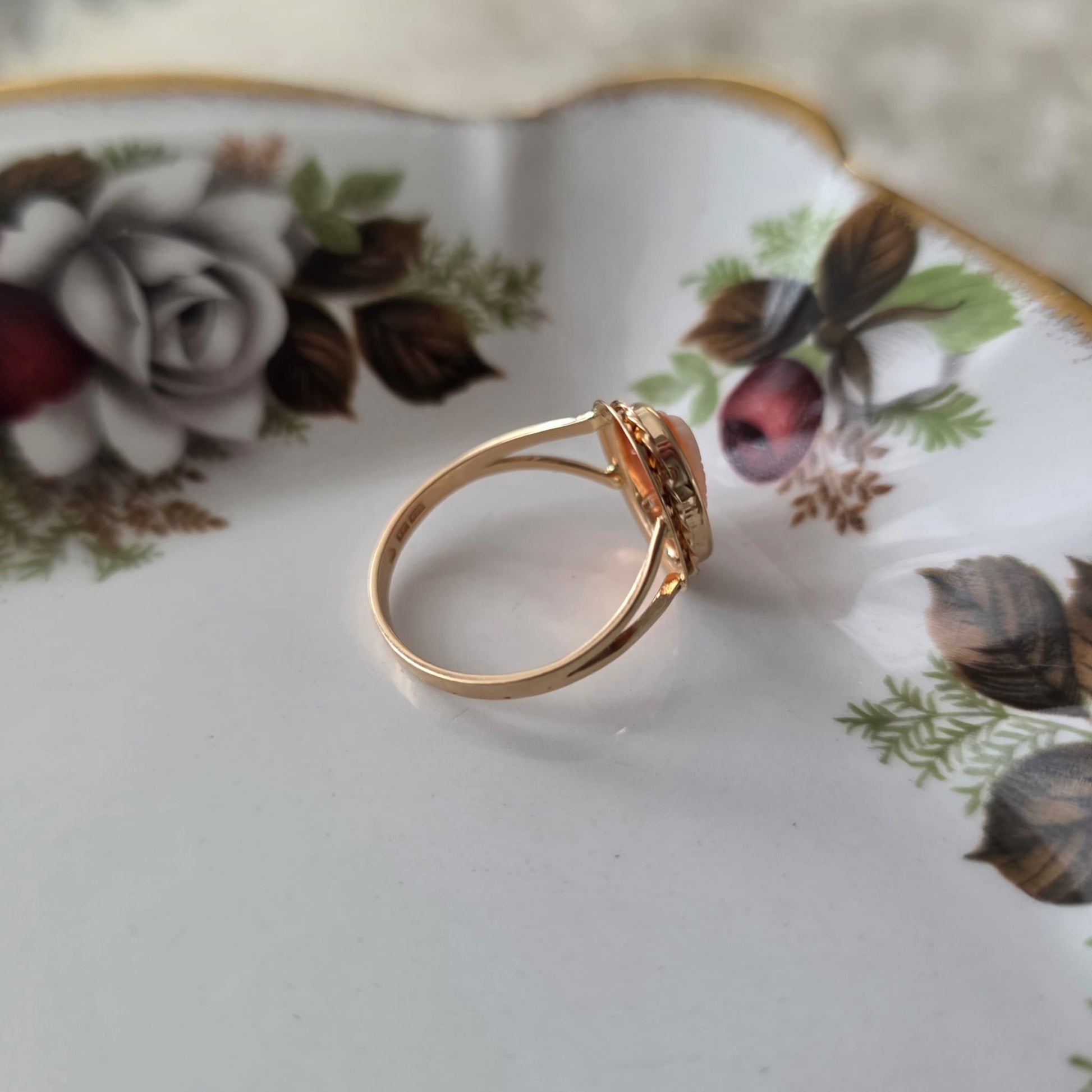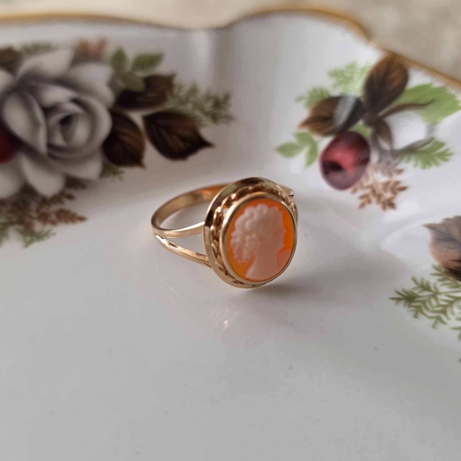 Deze vintage ring is gemaakt van 18k geel goud, voorzien van een mooie camee en is verkrijgbaar in maat 18.75 - 58. Deze mooie delicate dame heeft een bloem in haar haar. Camee is een grafeer techniek in edelstenen of schelpen. Door de verschillende tinten van de grondstof in lagen of in de 'hoogte' valt het afgebeelde motief meer op. Voeg een vleugje tijdloze elegantie toe aan uw sieradencollectie met dit vintage exemplaar.