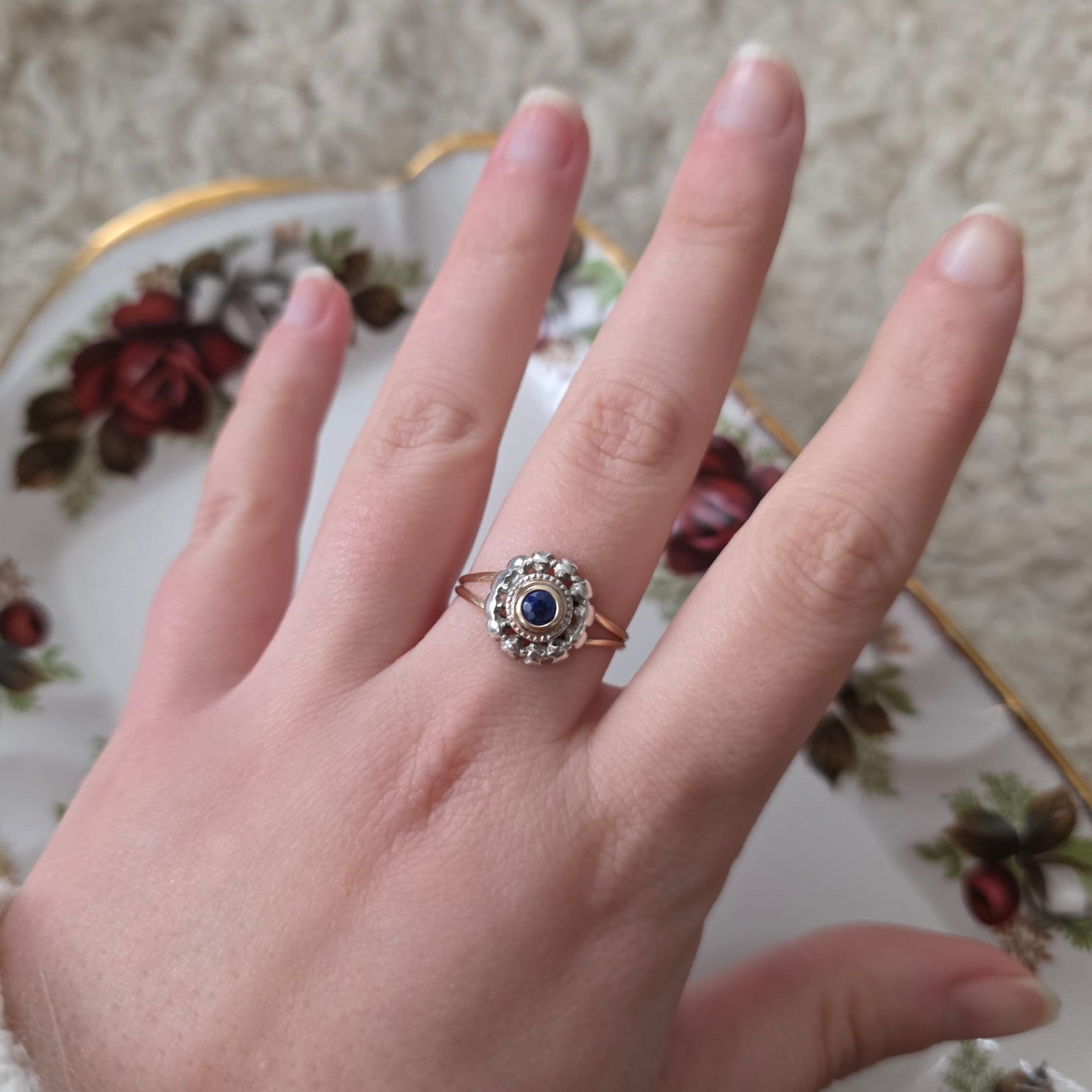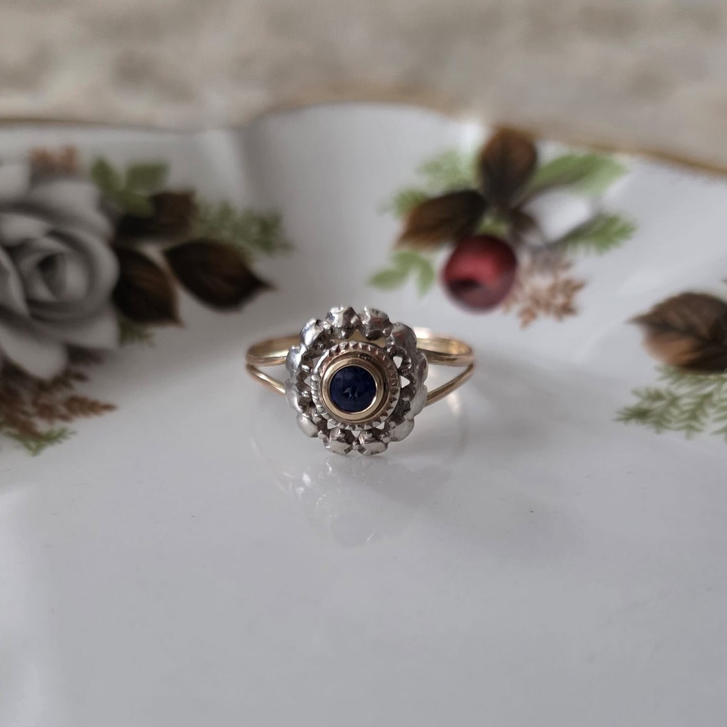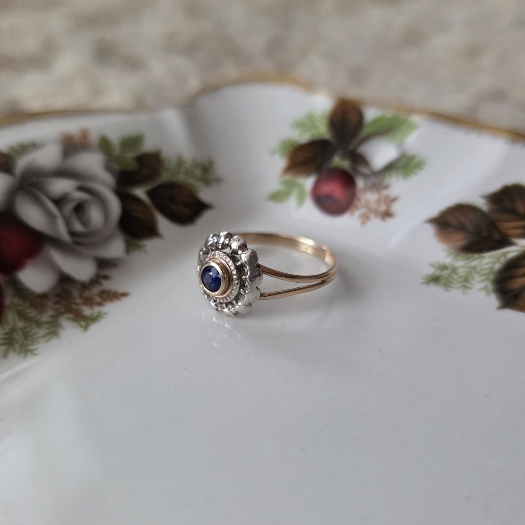 Deze antieke ring is gemaakt van 14k geel goud (goud code 585), voorzien van een zilveren zetting met een saffier en is verkrijgbaar in maat 19.5 - 61. Antieke gouden sieraden hebben vaak een warmere kleur, nijgend naar rosé, deze ring is ook goed te dragen met geel goud, rosé goud en zilveren sieraden. Deze ring is voorzien van een gouden band die in twee delen splitst naar de zetting, door dit doorlopende patroon van de schacht kan de ring niet op maat worden gemaakt. Voeg een vleugje tijdloze elegantie toe aan uw sieradencollectie met dit antieke exemplaar.