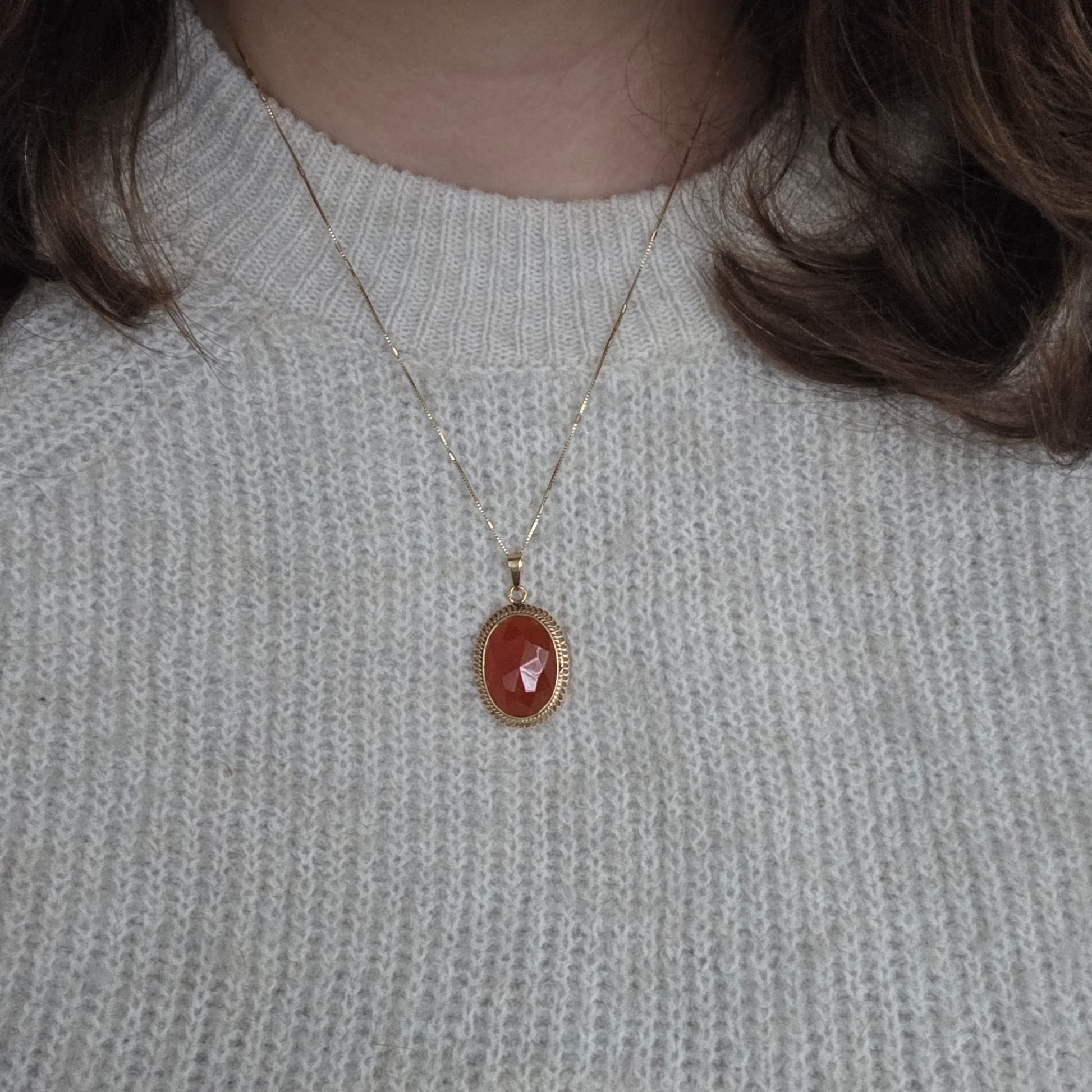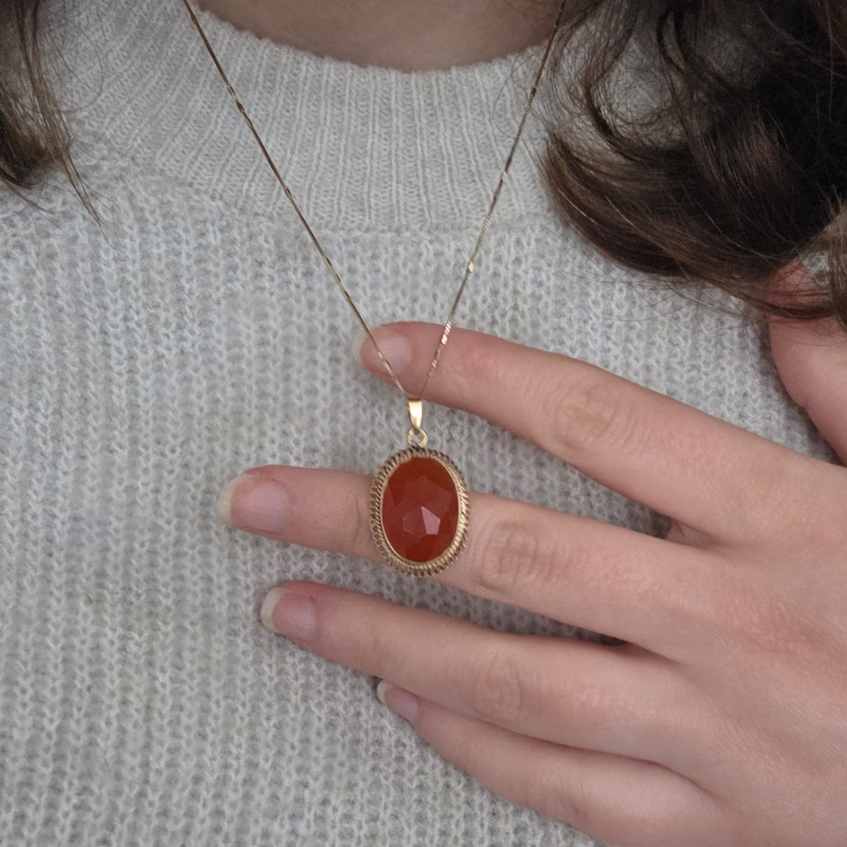 Deze vintage hanger is gemaakt van 14k geel goud (goud code 585), voorzien van een grote carneool edelsteen. De facetgeslepen steen zit in een prachtige traditionele zetting. Voeg een vleugje tijdloze elegantie toe aan uw sieradencollectie met dit vintage exemplaar.