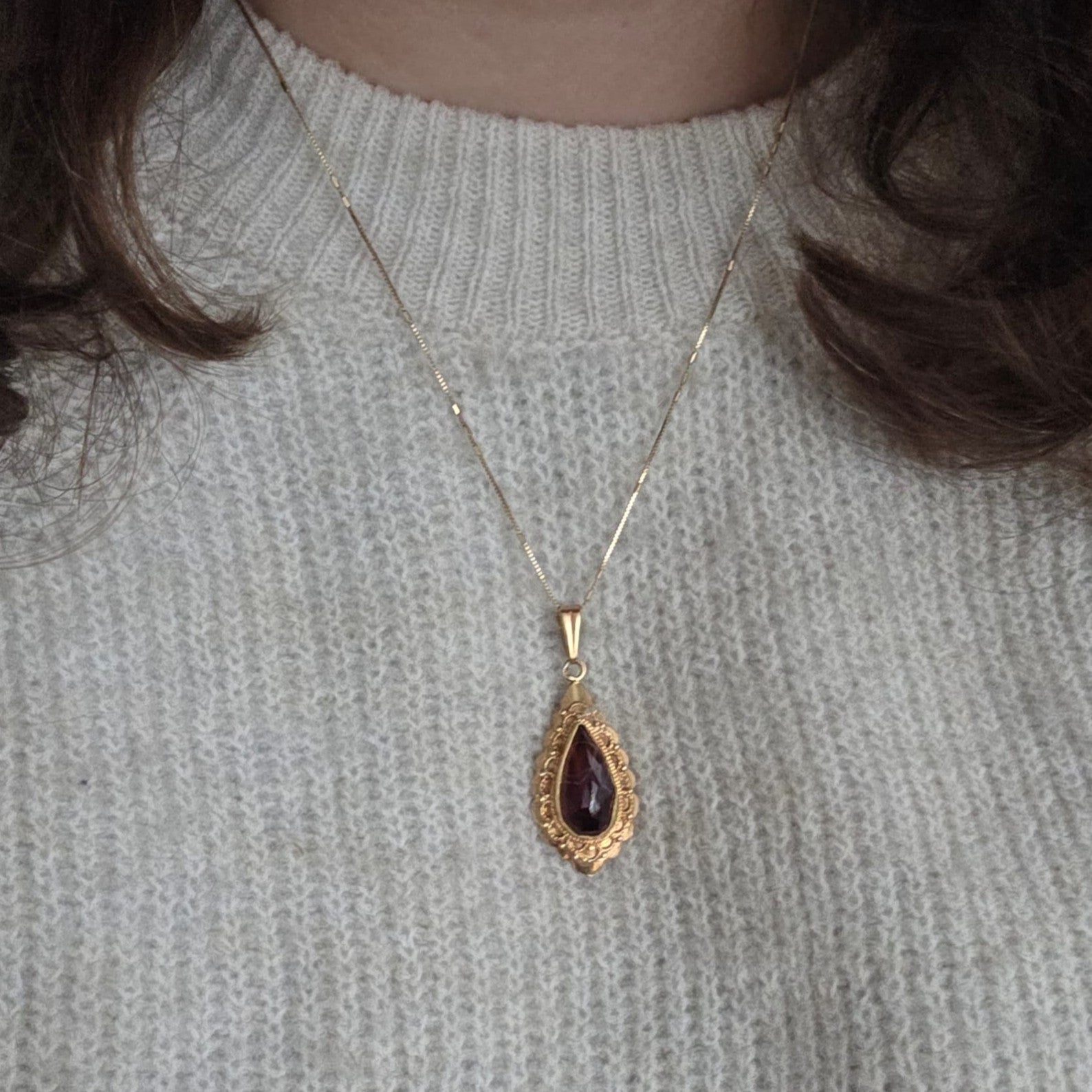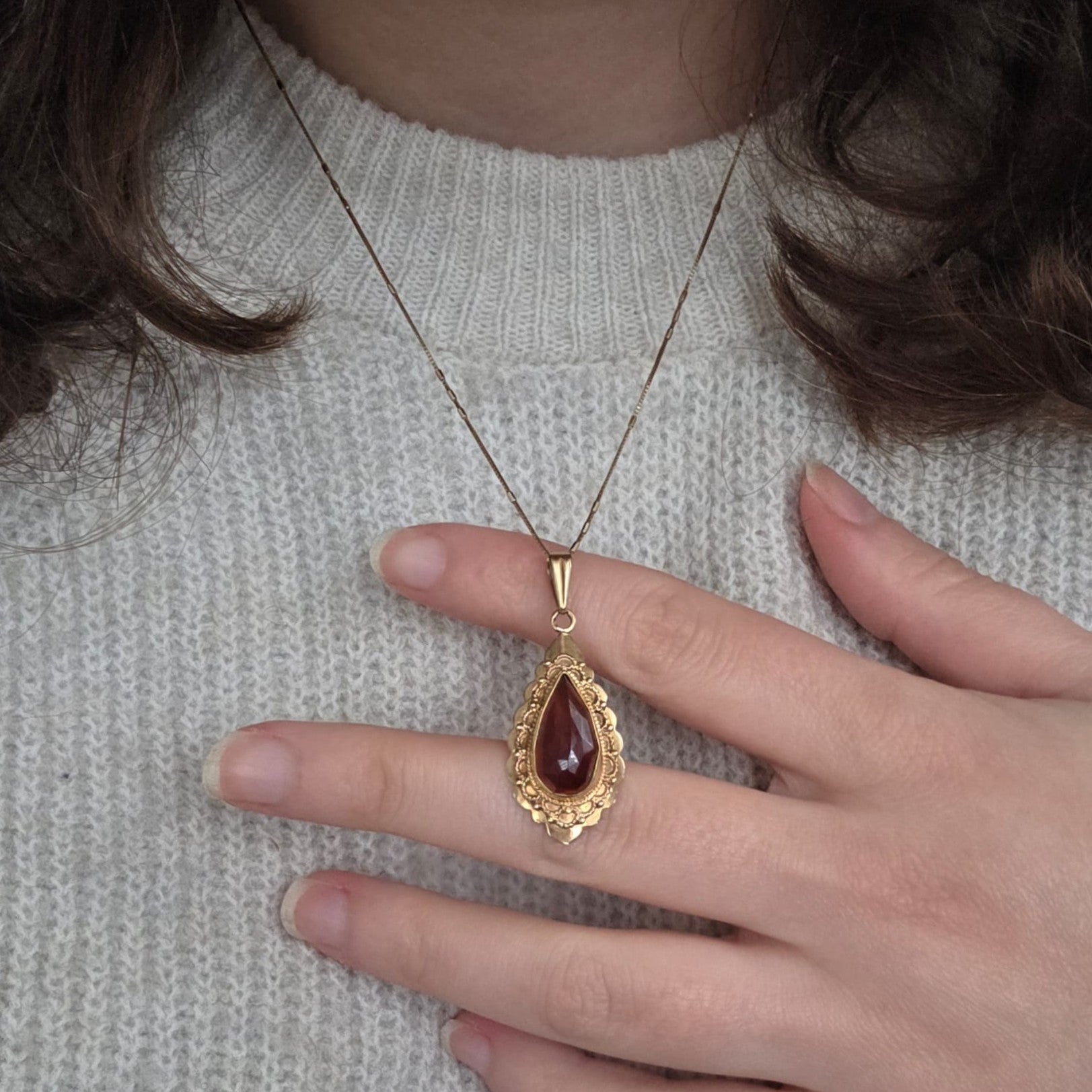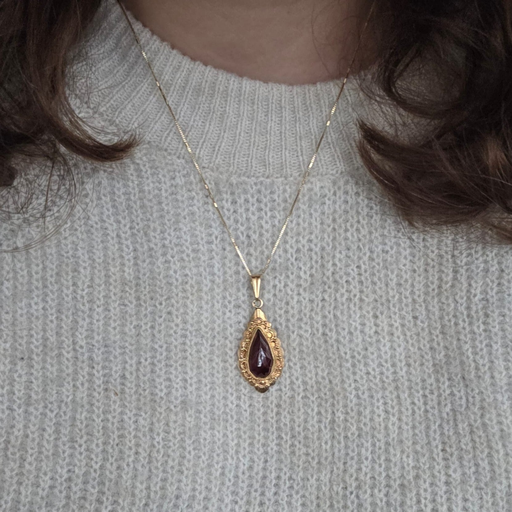 Deze vintage hanger is gemaakt van 14k geel goud (goud code 585), voorzien van een prachtige granaat edelsteen. De steen zit in een zeer gedetailleerde traditionele zetting. Voeg een vleugje tijdloze elegantie toe aan uw sieradencollectie met dit vintage exemplaar.