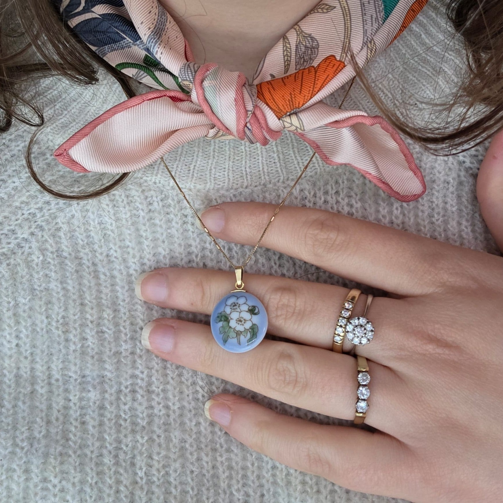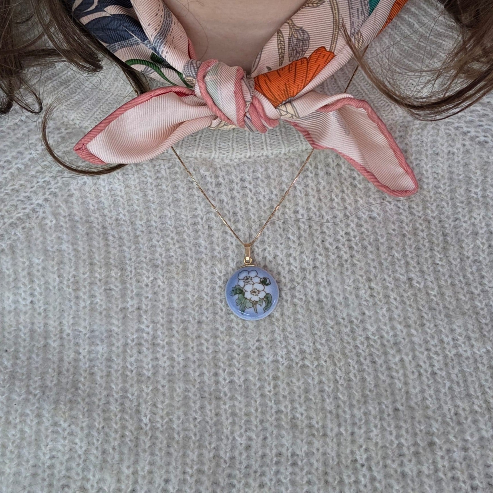 Deze vintage hanger is gemaakt van 14k geel goud (goud code 585), voorzien van een prachtig Bing & Grøndahl (B&G) porseleinen plaatje. Het porselein is beschilderd met bloemetjes op een zacht blauwe achtergrond. Voeg een vleugje tijdloze elegantie toe aan uw sieradencollectie met dit vintage exemplaar.