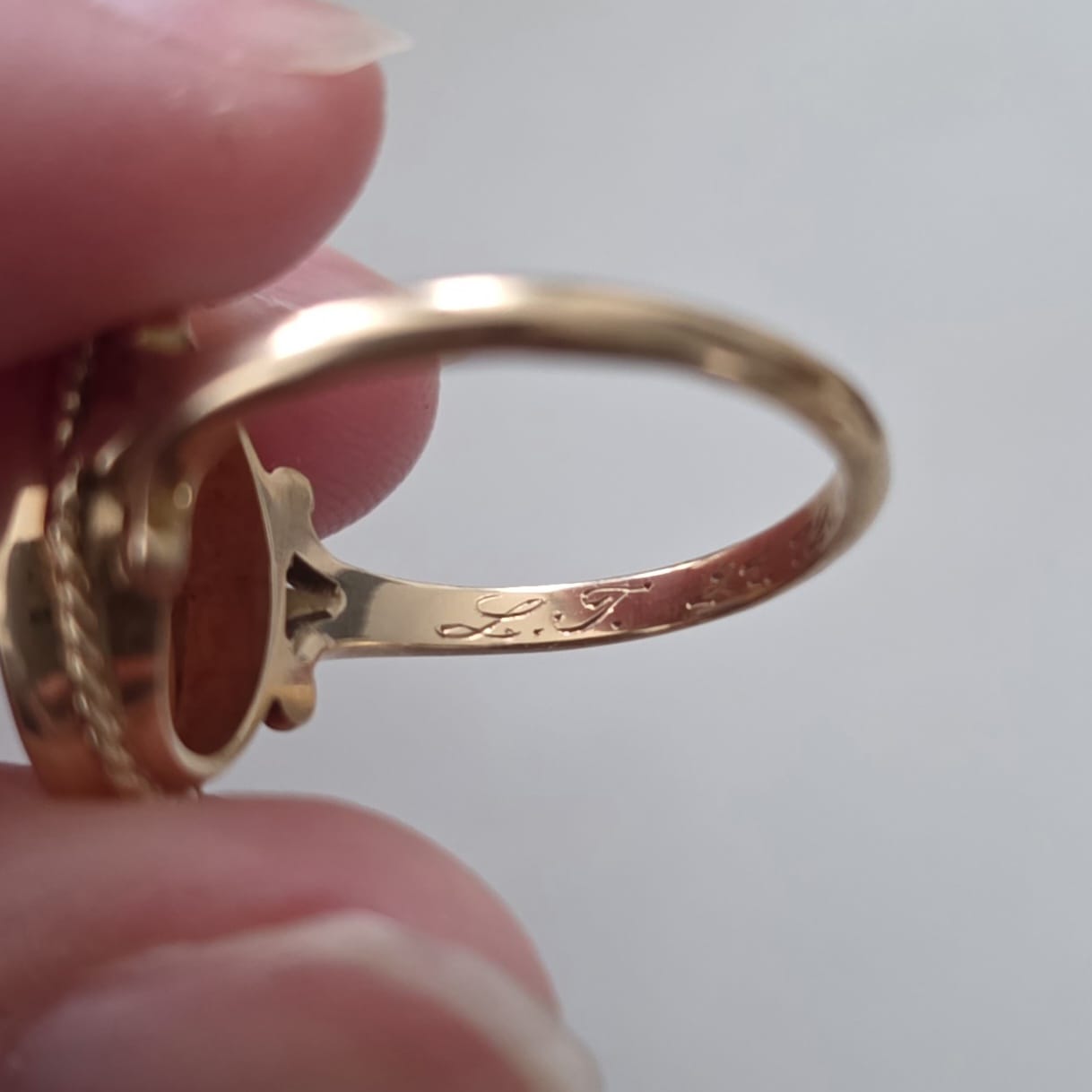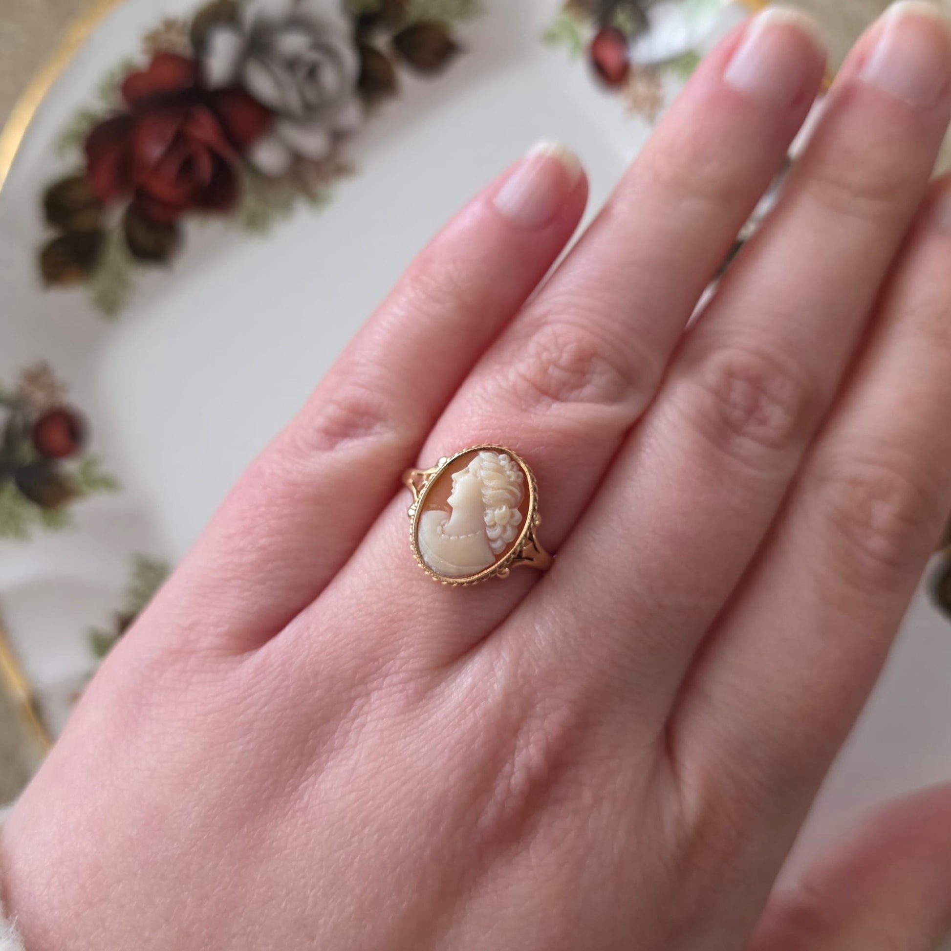 Deze vintage ring is gemaakt van 14k geel goud, voorzien van een mooie camee en is verkrijgbaar in maat 17 - 53. Deze ring heeft een gravure in de binnenkant van de ring (L.F. 24. 12. 57, zie foto's) waarschijnlijk is deze ring dus op 24 december 1957 cadeau gedaan. Deze mooie delicate dame heeft een ketting om. Camee is een grafeer techniek in edelstenen of schelpen. Door de verschillende tinten van de grondstof in lagen of in de 'hoogte' valt het afgebeelde motief meer op. Voeg een vleugje tijdloze elegantie toe aan uw sieradencollectie met dit vintage exemplaar.