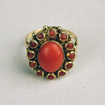 Deze vintage ring is gemaakt van 14k geel goud (goud code 585), voorzien van een entourage aan bloedkoraal en is verkrijgbaar in maat 18.25 - 57. De stenen zit in een prachtige bloem zetting. Voeg een vleugje tijdloze elegantie toe aan uw sieradencollectie met dit vintage exemplaar. Bloedkoraal; ook wel roodkoraal, edelkoraal of Corallium Rubrum genoemd is een zeer kostbaar en zeldzaam materiaal. Sinds jaren is het namelijk verboden om bloedkoraal te winnen om zo het koraal in de Middellandse zee te beschermen. Bij vintage sieraden kun je genieten van dit prachtige materiaal, zonder dat je schade aan het koraal toebrengt.