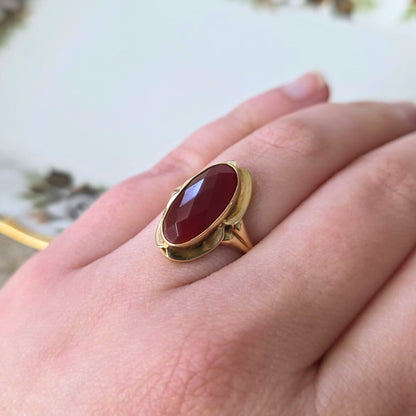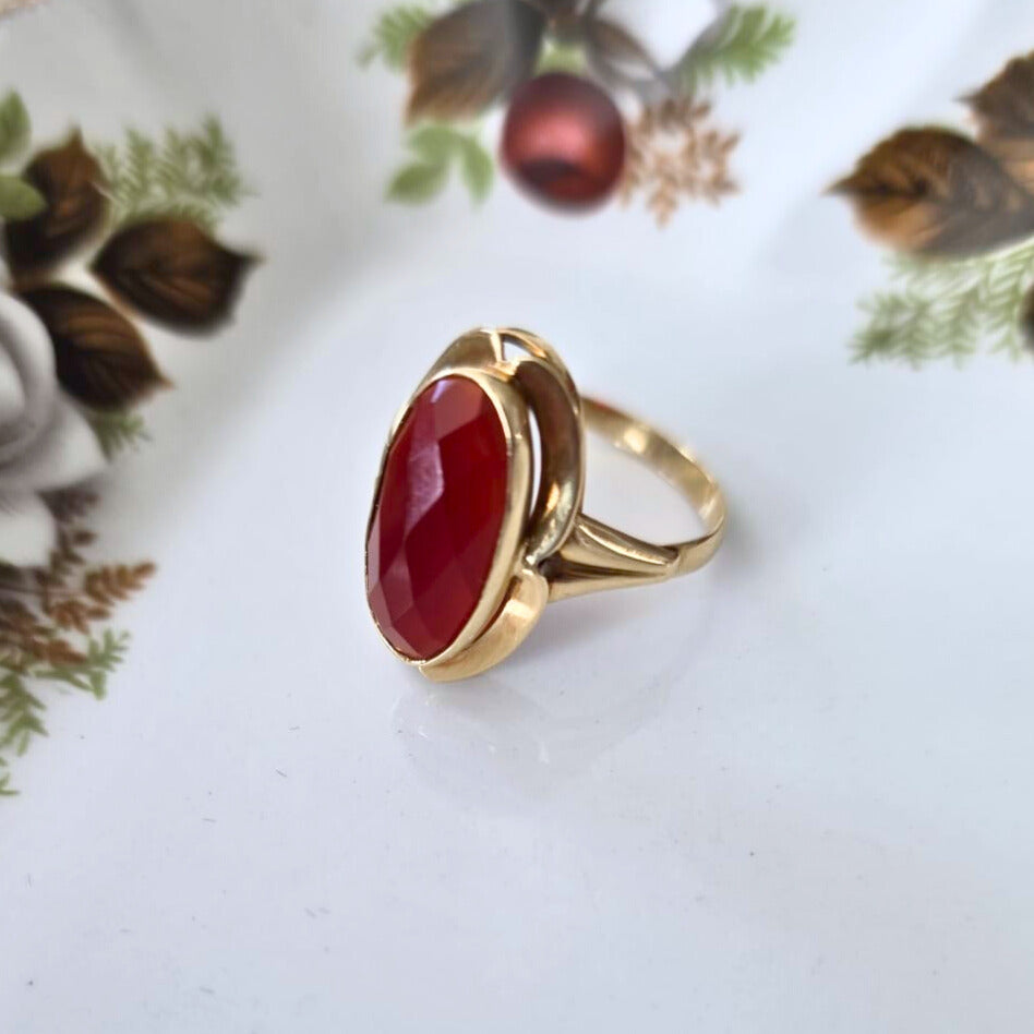 Deze vintage ring is gemaakt van 14k geel goud (goud code 585), voorzien van een oranje rode carneool en is verkrijgbaar in maat 17 - 53. De carneool zit in een prachtige zetting met sierlijke details. Voeg een vleugje tijdloze elegantie toe aan uw sieradencollectie met dit vintage exemplaar.