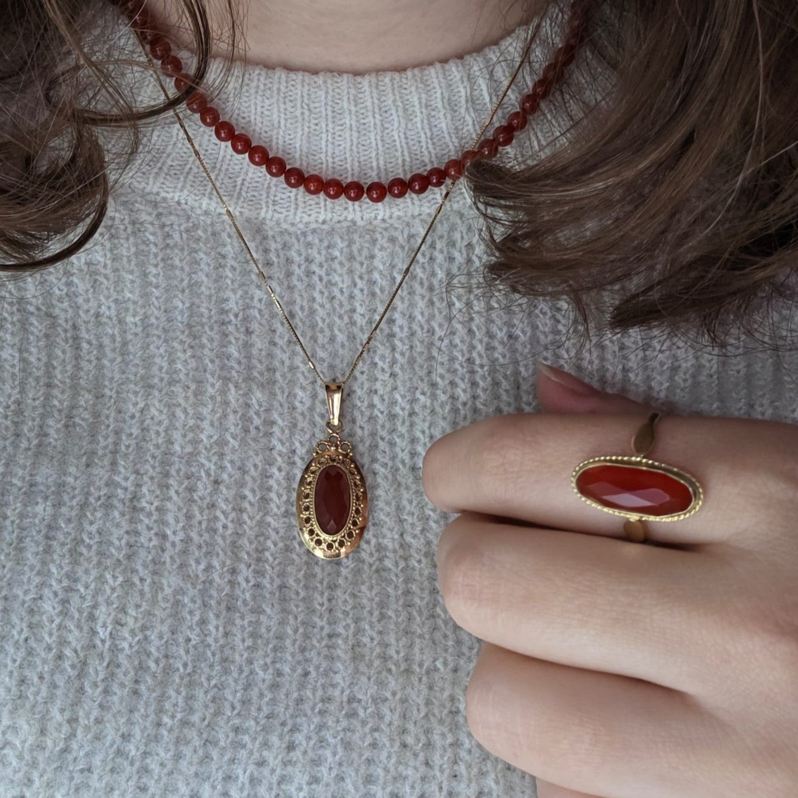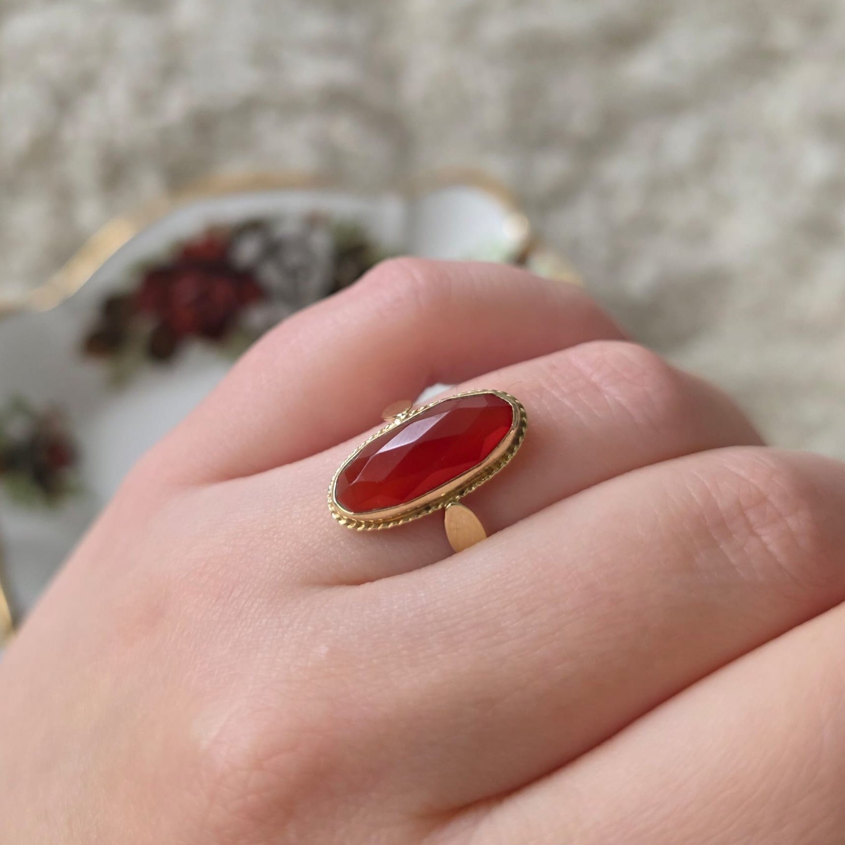 Deze vintage ring is gemaakt van 14k geel goud (goud code 585), voorzien van een oranje rode carneool en is verkrijgbaar in maat 18.5 - 58. De carneool zit in een prachtige minimalistische zetting. Voeg een vleugje tijdloze elegantie toe aan uw sieradencollectie met dit vintage exemplaar.