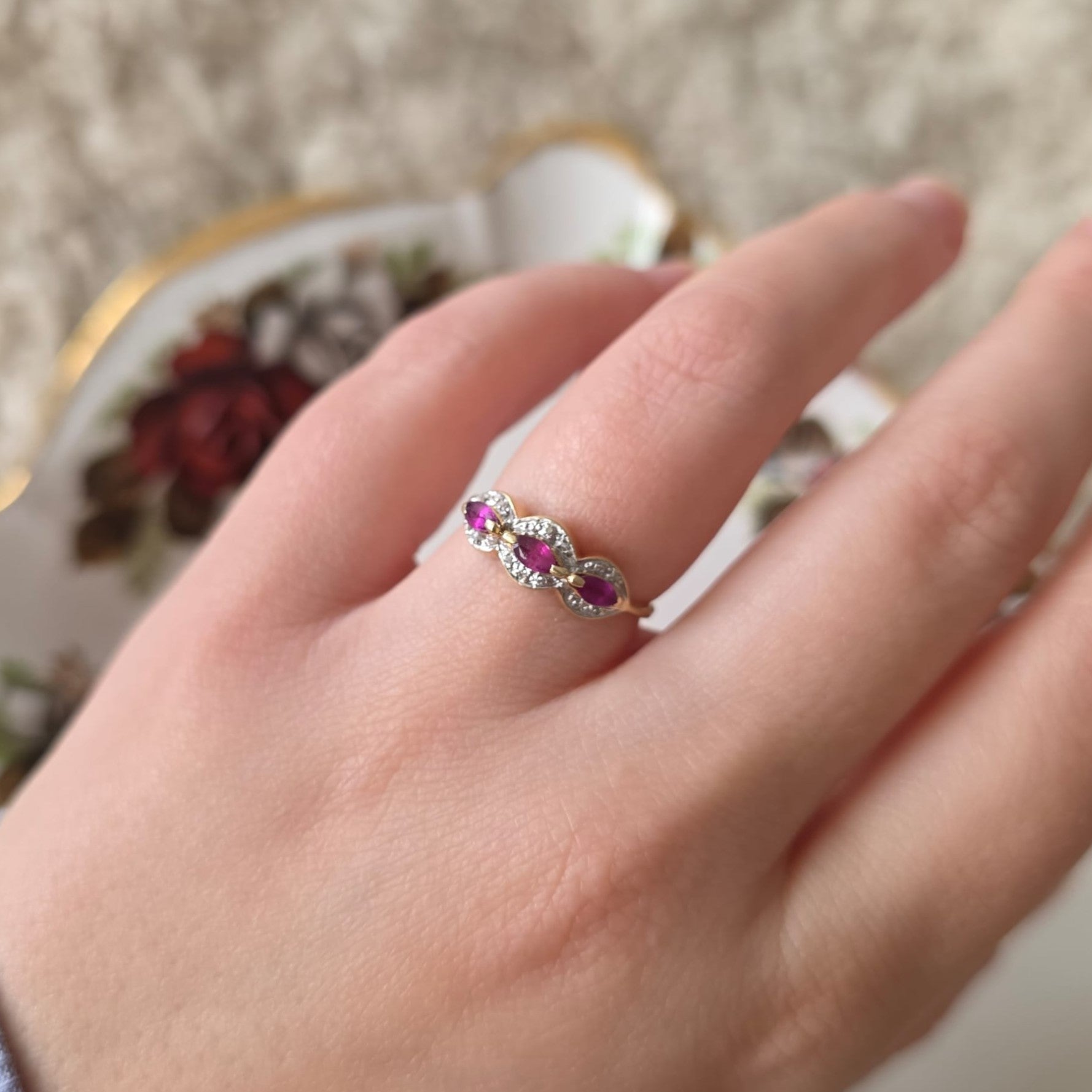 Deze vintage ring is gemaakt van 14k geel goud (goud code 585), voorzien van een prachtige rij robijnen en diamanten en is verkrijgbaar in maat 17 - 53. Deze ring is prachtig om alleen te dragen, of draag hem bij een andere ring voor een gelaagde look. Voeg een vleugje tijdloze elegantie toe aan uw sieradencollectie met dit vintage exemplaar.
