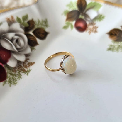 Deze vintage ring is gemaakt van 18k geel goud (goud code 750), voorzien van een prachtige opaal en is verkrijgbaar in maat 15 - 47. Beweeg de steen en zie al het vuur vonkelen in de meest mooie kleuren. Voeg een vleugje tijdloze elegantie toe aan uw sieradencollectie met dit vintage exemplaar.