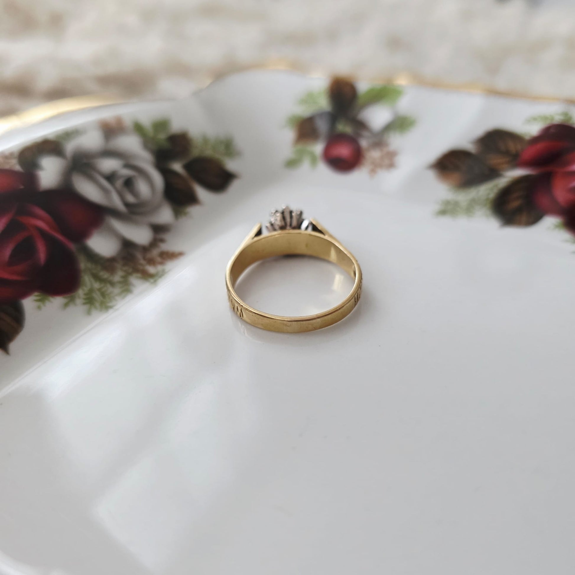 Vintage 18k gouden verlovingsring met diamant bark finish