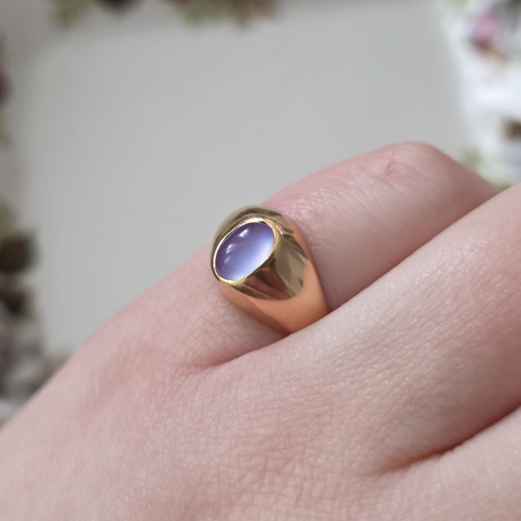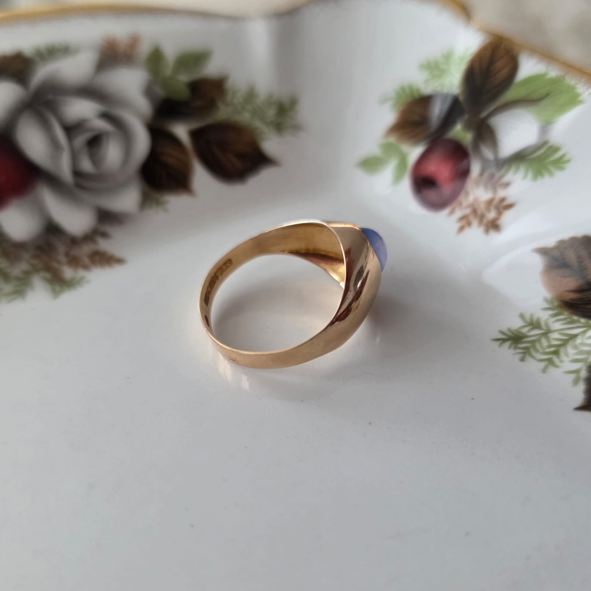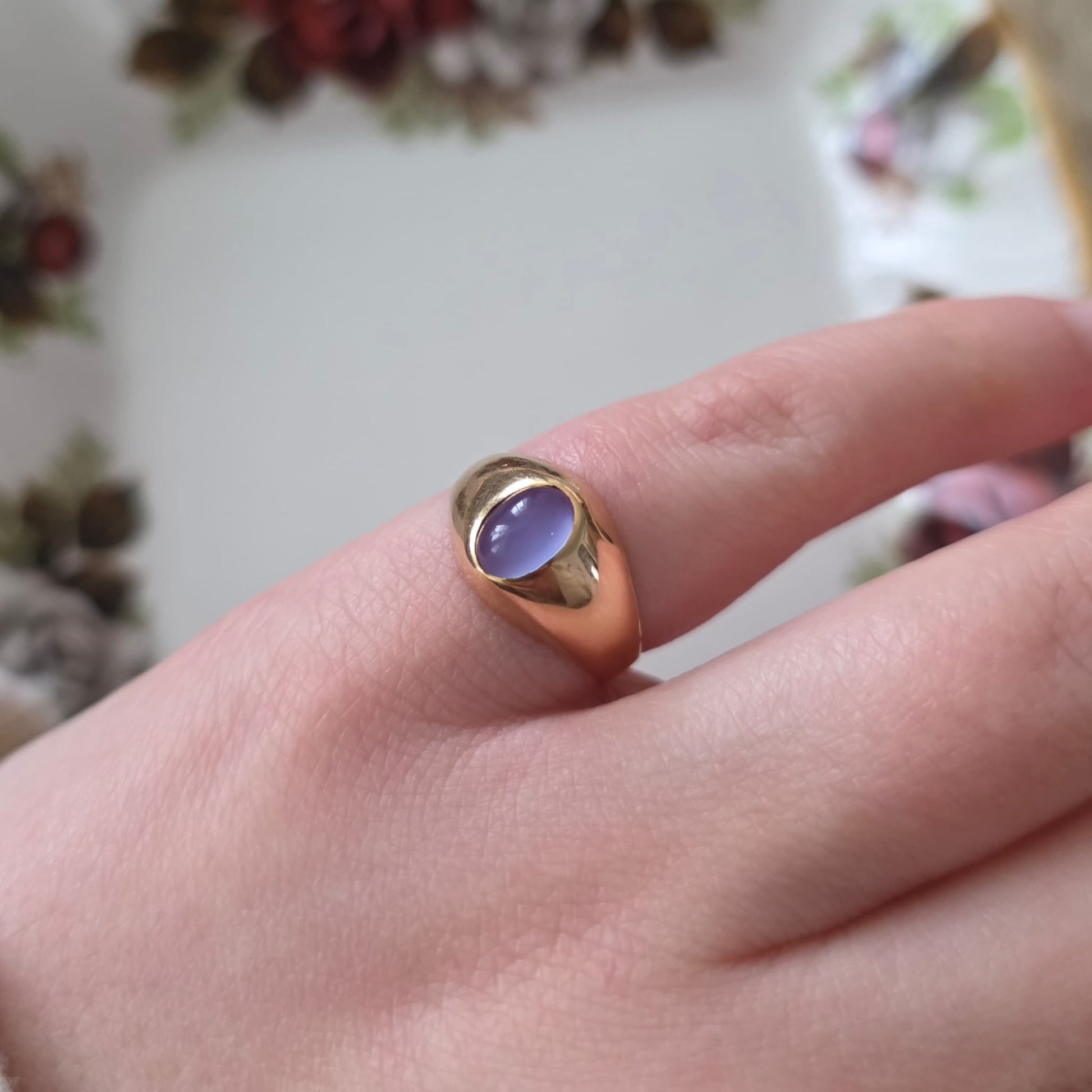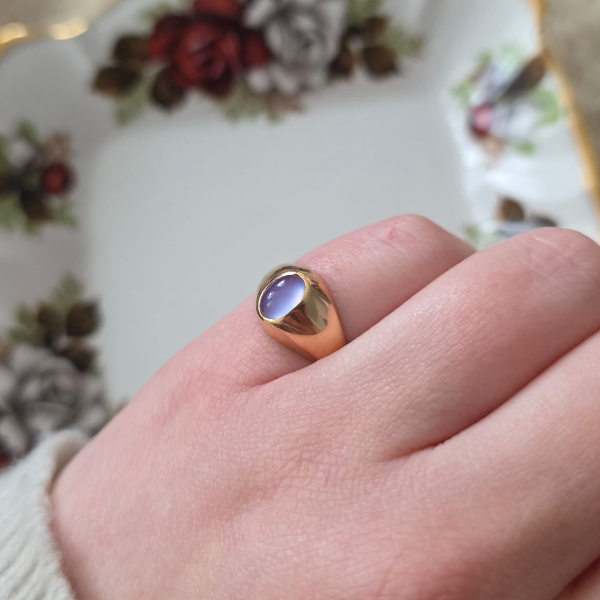 Deze vintage ring is gemaakt van 18k geel goud, voorzien van een prachtige cabochon chalcedoon en is verkrijgbaar in maat 16.25 - 51 (door de brede band kan de ring iets kleiner vallen). Het licht danst prachtig in de steen, op de hand is dit een absolute showstopper! Voeg een vleugje tijdloze elegantie toe aan uw sieradencollectie met dit vintage exemplaar.